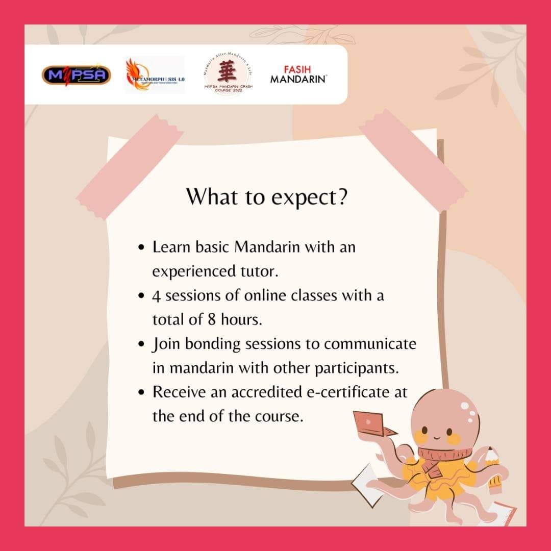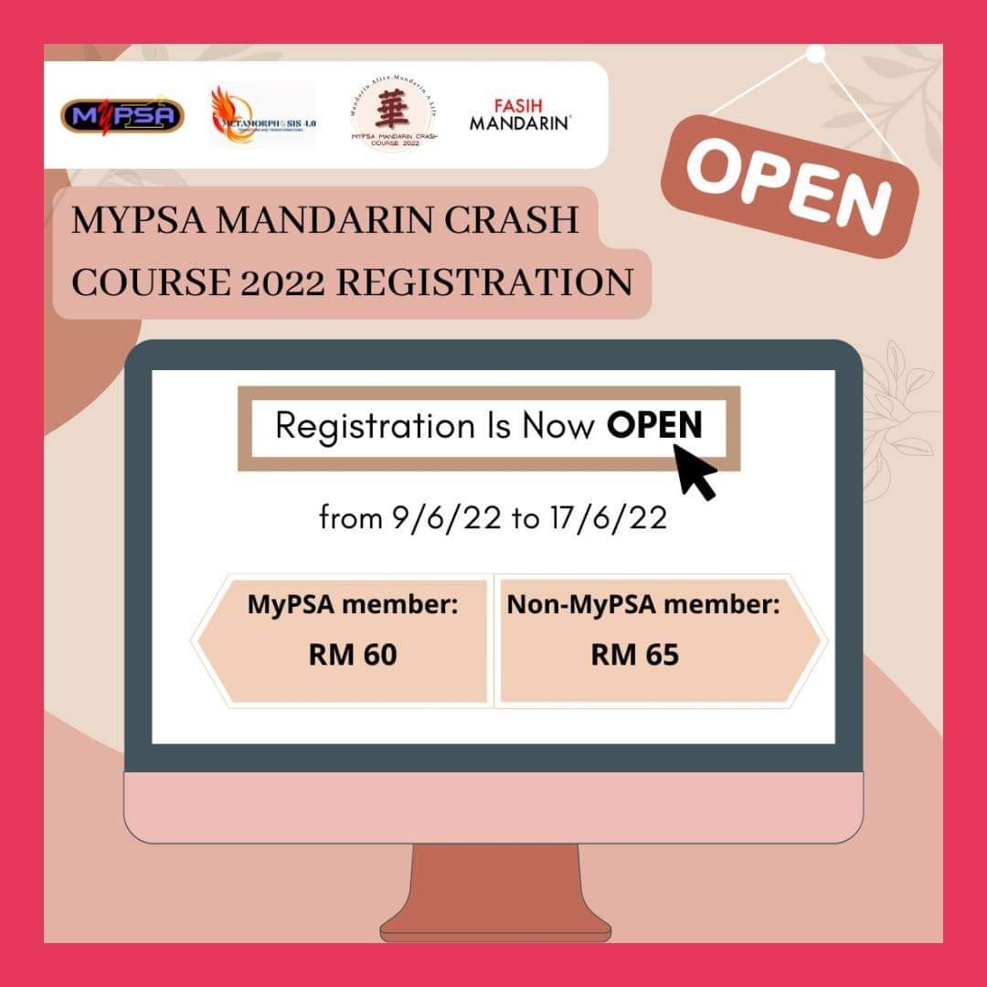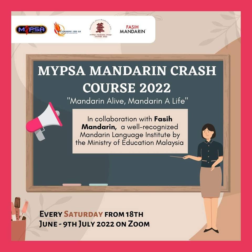 MyPSA Mandarin Crash Course 2022 is an one month programme organised by the Malaysian Pharmacy Students’ Association (MyPSA) with the aim to create a platform for pharmacy students under MyPSA to learn the basics of mandarin language. This programme will be hosted virtually and will include bonding sessions to allow participants to mingle with each other. Themed ‘Mandarin Alive, Mandarin A Life’, this programme is focused on introducing the basics of mandarin language to the participants. With the involvement of experienced tutors, this programme’s target is to reduce the language barrier between students by introducing the basics of mandarin to the participants.