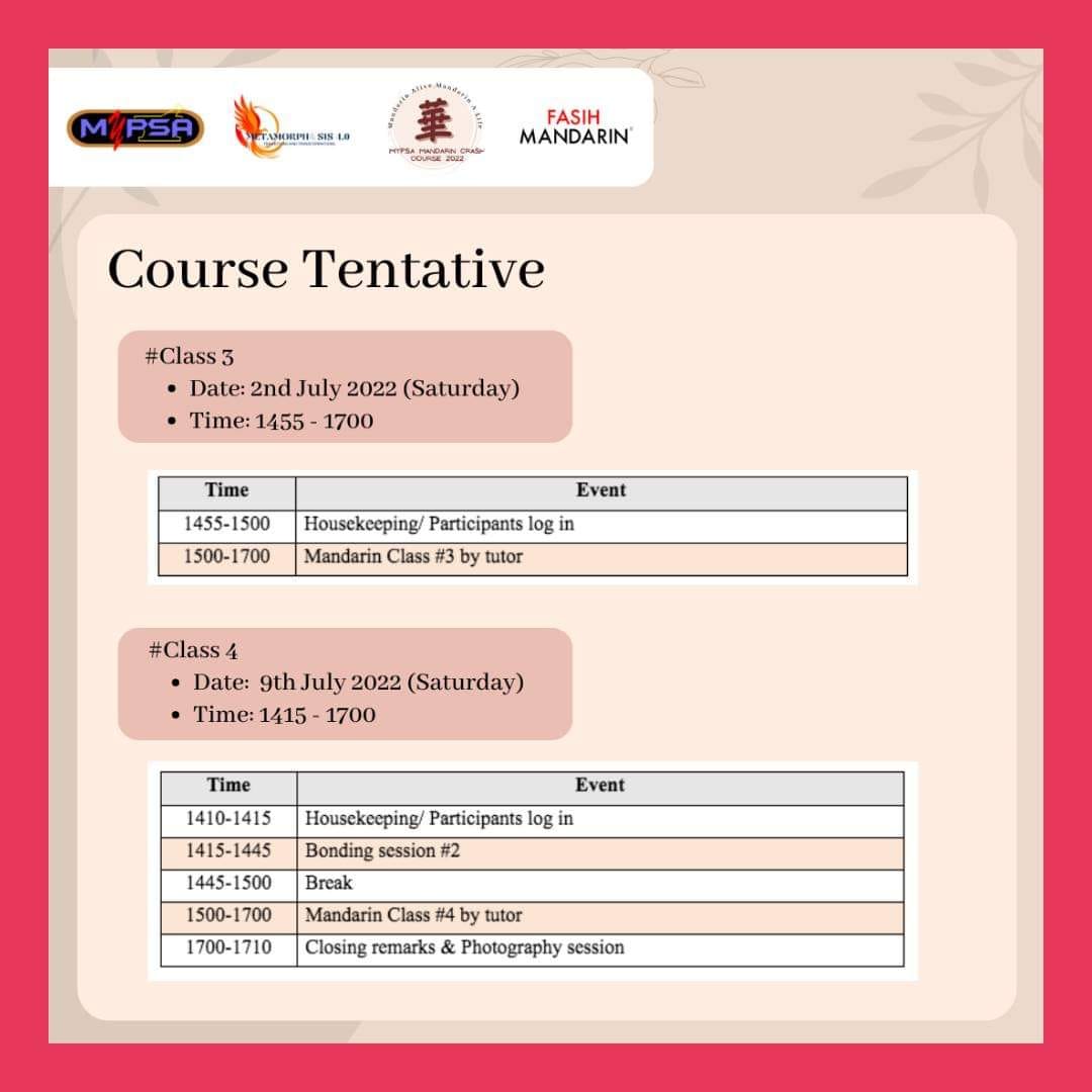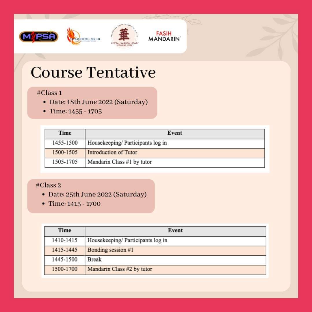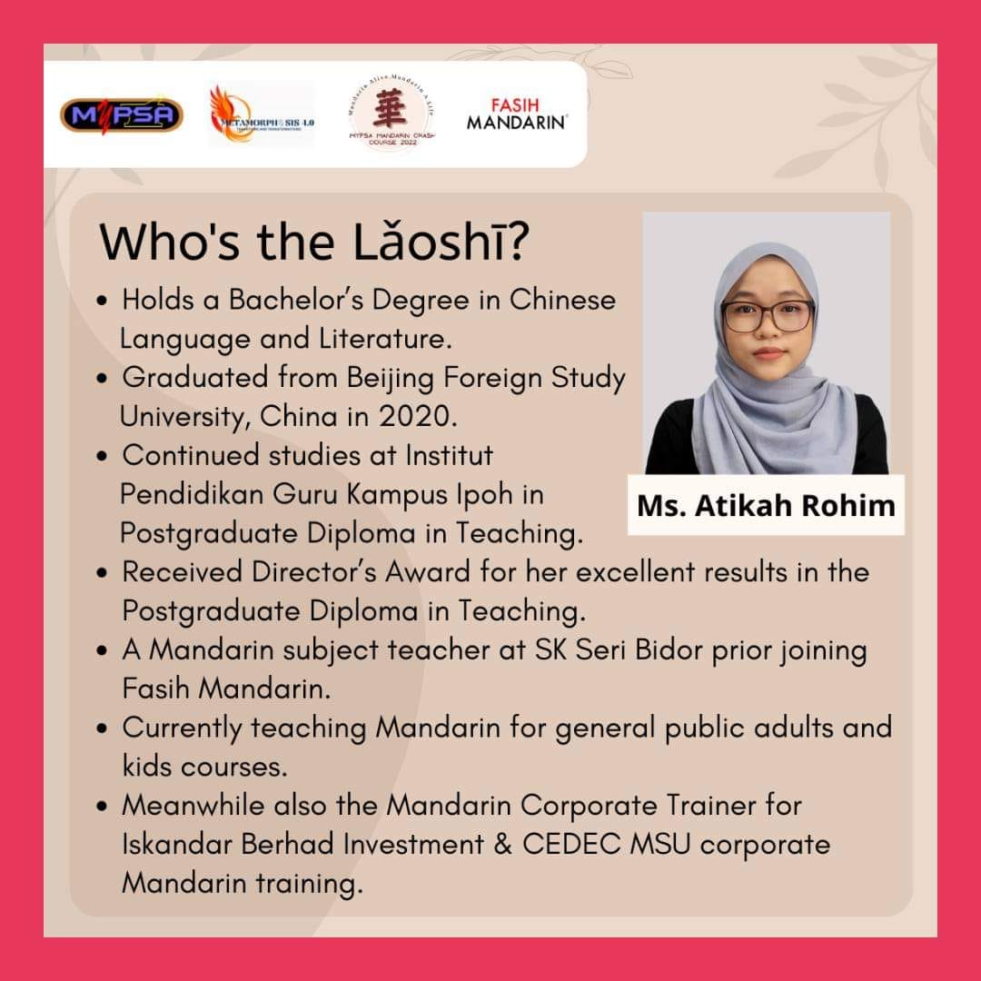 MyPSA Mandarin Crash Course 2022 is an one month programme organised by the Malaysian Pharmacy Students’ Association (MyPSA) with the aim to create a platform for pharmacy students under MyPSA to learn the basics of mandarin language. This programme will be hosted virtually and will include bonding sessions to allow participants to mingle with each other. Themed ‘Mandarin Alive, Mandarin A Life’, this programme is focused on introducing the basics of mandarin language to the participants. With the involvement of experienced tutors, this programme’s target is to reduce the language barrier between students by introducing the basics of mandarin to the participants.